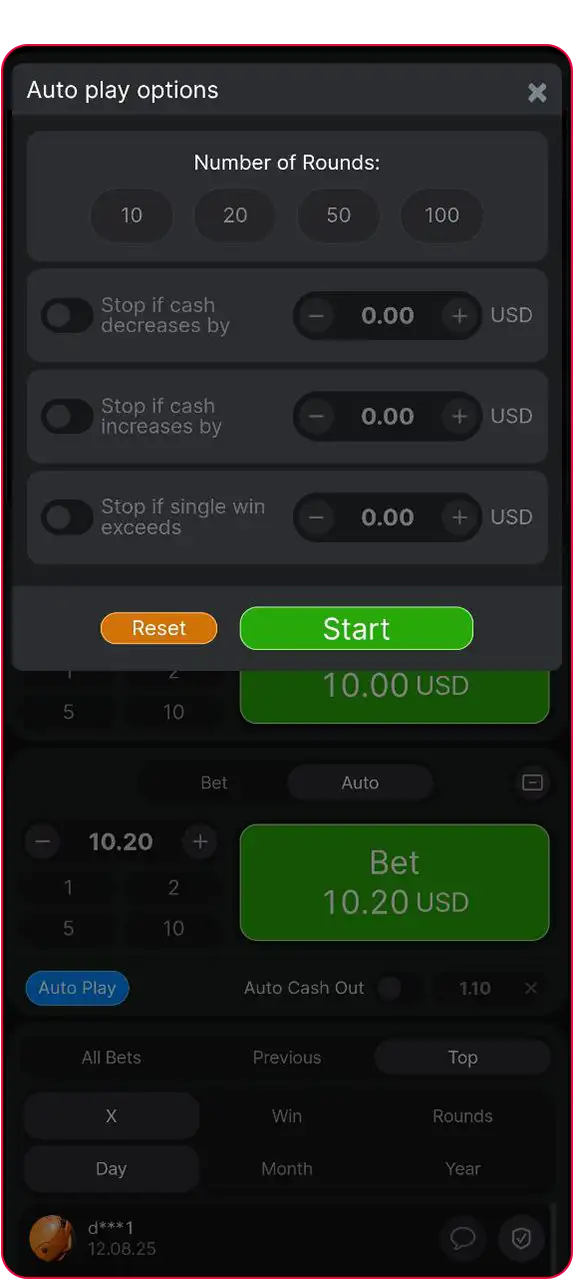 Auto Cashout: You set a multiplier in advance, upon reaching which your bet will be automatically cashed out. This tool helps you stick to your strategy and eliminates the emotional factor.